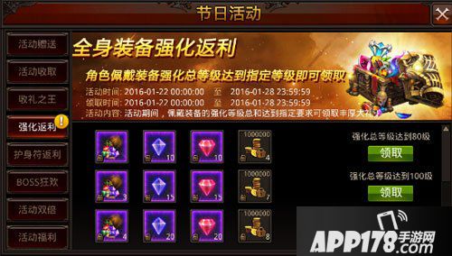 活动内容:活动期间, 全身强化总等级达到指定要求可领取丰厚大礼