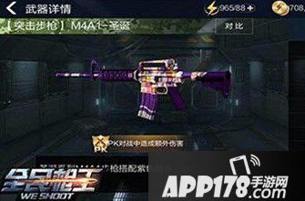 圣诞M4这把枪,就像前面提到的一样,是普通M4的稳定提升版,说他稳定,是因为它并不是M4系列中最突出的枪械,当然也不是最差的,至少突袭用起来没有圣诞用着舒服。另外,圣诞M4的弹道稳定性继承了M4应有的稳定,快速单点的节奏也可以很快但又不失准度,扫射的话,一般。总体上来说吧,圣诞这把M4算是一个过渡的M4吧,小伙伴们可以买来试试手,但是小编不建议长期使用这把枪,毕竟它的性能还不是很突出。 更多精彩内容请进入APP178手游全民枪王专区查看哦!
