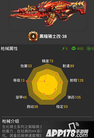黑暗骑士改38是从AK系列基础上演变而来的步枪,属性和各方面在一定程度上都有所提高,黑暗骑士改38是火红色的外表,非常的帅气拉风。