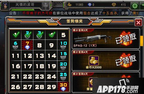 只要你当天第一次登录游戏,全民枪战就会弹出连续登录奖励页面,你可以选择签到领取当天的奖励哦!