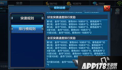 全区的排行榜咱们也不指望了,我们来看看好友排行榜,第一名可以获得M4-16碎片3和紫色配件*1,M4-16是一把非常不错S级突击步枪,第二第三名也只是金币上的区别,枪械碎片都不会少,运气好的话2个月我们就可以获得一把M4-16,这个是其他活动都无法比拟的。