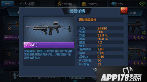 G36E的火力伤害仅次于M4A1-贪狼,排名突击步枪第二。射速和弹夹并不算出众,属于射速偏慢型突击步枪。G36E最大的亮点是精准度,0.65的精准度高出所有枪械一大截,M16A2这种低射速、低伤害只靠精准度吃饭的枪械也没有G36E高。