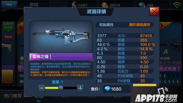 在枪械介绍中就能看出这把雷神之锤的霸气,机炮,并不是普通的机枪,发射的子弹是12.7的爆炸弹药,玩家即便没有射击到敌人,在爆炸范围内,也能对敌人造成溅射伤害。射速不高,伤害惊人,范围惊人,是这把机枪的最大特点。