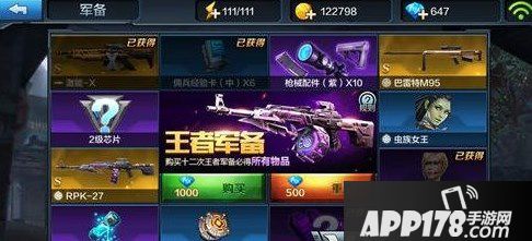 王者军备相对于钻石军备价钱更高,不过奖励也是能看得见的有两把非卖品枪械,RPK-27和巴雷特M95都能直接获得,不过每抽取一次下次消耗的钻石都会增长,抽满12次需要约2W的钻石,如果能在10次左右抽到这两把稀有枪械还能接受,如果是脸黑的玩家只能花别人一倍的价钱了。这里值得一提的是激能-X基本会在4-5次抽取到,成本在2000钻石左右。