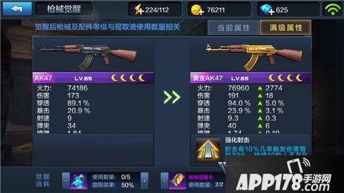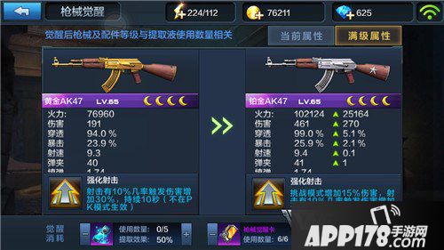 从AK47觉醒到铂金AK47需要觉醒两次也就是10个觉醒卡加上10个提取液,总计11000钻石附加一些金币,虽然看起来成本很高,但是一天只能就能得到一把满属性的铂金AK47,综合花费和培养基本无异,觉醒的性价比明显高于培养。