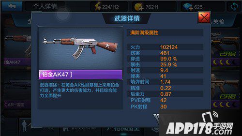 铂金AK47相对于黄金AK47的提升就不是一星半点了,铂金AK47在挑战模式的额伤害加成让其成为挑战模式第一突击步枪,在PVP模式里铂金AK47的伤害比M4A1-贪狼还要略高一筹,同样也是PVP的第一突击步枪,是目前版本最强突击步枪。