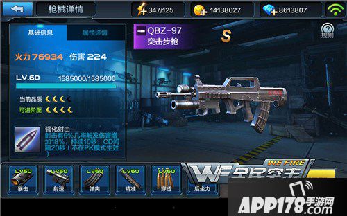 这里使用的是60级的QBZ-97,为了达到测试效果60级的97和65的战龙火力基本一致。QBZ-97的枪械技能就是强化射击,触发几率和增伤效果都比较中庸,和其他强化射击枪械一样这里就不多作介绍了。