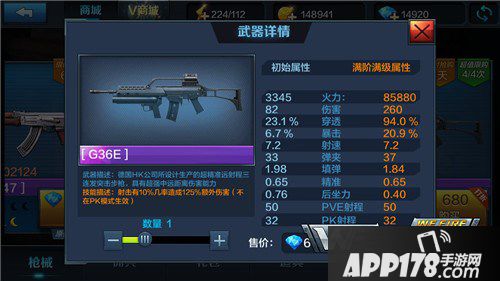 G36E是非常适合新手的突击步枪,自动点射三枪停滞恢复准星。G36E的伤害在PVP模式绝对算顶级突击步枪,射速上是所有突击步枪里最慢的,毕竟低射速加自动恢复准星。目前G36E售价为680钻,性价比比激能高出很多,非常推荐新手玩家使用。