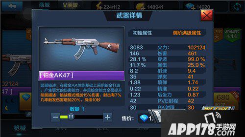 铂金AK47是目前PVP模式最好用的突击步枪,伤害上不逊于贪狼,射速上又是突击步枪里最快的。铂金AK47不仅可以通过觉醒获得,直接购买目前只要1350钻石升到65级也不过1万钻石,关键随着版本铂金AK47还能继续觉醒,对于长期玩突突的玩家能成长的枪械是最佳选择。