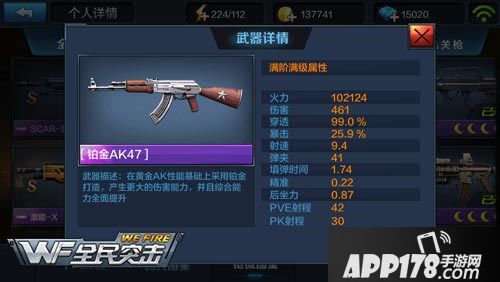 铂金AK47作为目前最优秀的突击步枪,各项属性都是非常优秀的,高达461的伤害搭配9.4的射速可以瞬间击杀阻挡在我们面前的敌人。