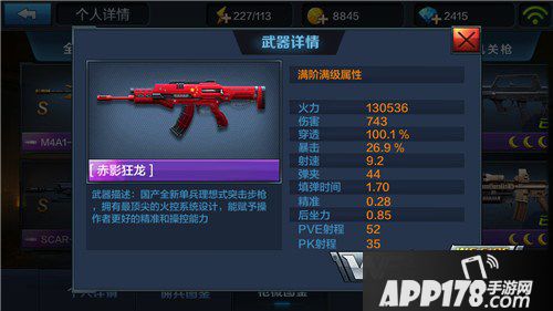 赤影狂龙属性上高火力、高精准、高射速都是它的优点,不过挑战模式里弹夹的数量有很多玩家看得很重,对于喜欢用机关枪的玩家来说赤影狂龙的弹夹是小了一点,44发的弹夹比起机关枪来说少了一倍,不过换弹夹的速度赤影狂龙也比机关枪快了近一倍,如何选择还是看个人观点。