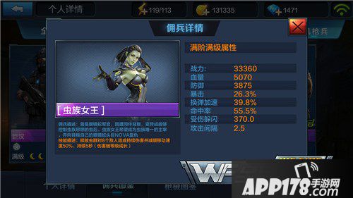 虫族女王是控制输出型的机枪兵,见缓移动速度除了对付生化关卡,远距离的敌人减速了一样能照常输出。虫族女王在新挑战力作用在机枪兵中是比较小的,这里不推荐大家培养。