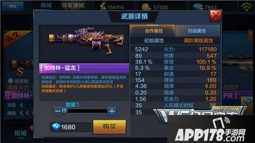 加特林-猛龙是第一次上架价格上没有优惠,1680钻石是目前能购买的枪械里价格最高的,对于只玩合作的玩家直接购买加特-猛龙是没问题的,如果还用机关枪玩挑战的的话很多斗士这类机枪更加全面。