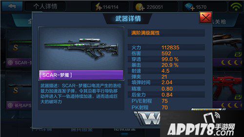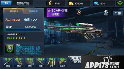 SCAR-梦魇的火力高达11万,是目前火力最高的狙击枪。在射速上4.5的射速属于高速狙击枪,SCAR-PR的射速和梦魇一样,不过伤害和射速和梦魇完全没得比,21发的弹夹也是狙击枪里最大,不过梦魇的精准度只有0.80,是唯一一把准星会抖动的狙击枪。