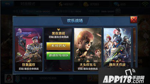欢乐模式里目前有四种模式。最考验技术的莫过于黑夜激战了。在一片漆黑的夜晚里,凭借时不时的闪电、探照灯和照明弹来判断敌人的位置从而消灭敌人。在黑夜激战里首先并不是杀伤敌人,而是保存自己。