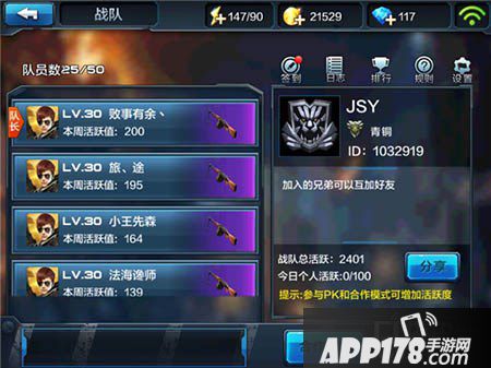 战队中主要的就是活跃度,战队的活跃度需要通过战队队员的活动来获得,队员们参加我们的合作模式以及PK模式是最直接的获得方法,另外我们通过签到以及消耗钻石也是能够获得一定的活跃度的。我们战队的活跃度决定了我们的战队段位,每周系统会扣除一部分活跃值来作为战队消耗,这样如果我们的活跃值不足的话就很容易导致我们的战队段位降低了。