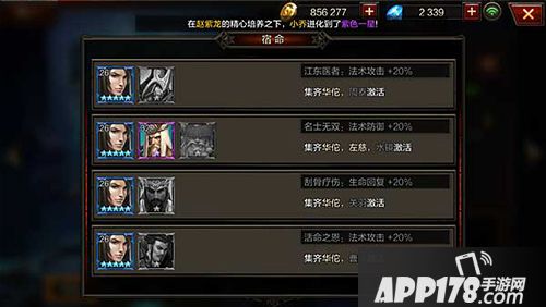 在武将界面,选择武将形象左下角的“角色”页,在右侧下部可见宿命系统,华佗一共有四个宿命。我们点击上图右侧下部的宿命所在的区域,可以跳转到宿命系统界面。当我们集齐指定的武将组合后,可以在宿命系统界面激活对应的宿命,比如华佗的宿命“江东医者”,搭配周泰武将可以提升20%法术攻击。
