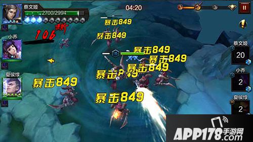 蔡文姬的大招是法系输出的典范,“悲风鸣月”可以向一个方向施加一个AOE的高额法术攻击伤害。这个伤害确实很高,很高,很高,重要的事情说三遍。有多高?可以看图中的数字,在27这个等级,普通攻击打到这些小兵身上的伤害大约在160左右,而“悲风鸣月”可以达到849的暴击伤害。当然,这个技能也很容易空,容易空,容易空,重要的事情说三遍。所以“悲风鸣月”的释放时机是有讲究的,最好是接在控制技能之后,这样可以保证100%命中。