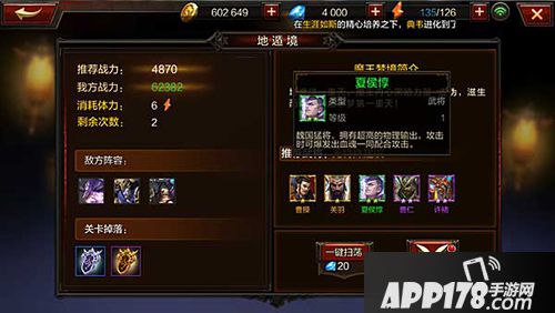 地遁镜共有六个难度,每个难度开启的的等级不同;奖励是法术系武将装备,建议用物理系武将大比较轻松。该副本没有特殊要求,我们只需挑选出最强阵容去进去击杀魔王即可;对于通关过的难度模式,可以通过消耗20钻石进行2次扫荡。值得注意的是,大师、噩梦、深渊级别难度的地遁镜将在我们76级、91级、101级开启。