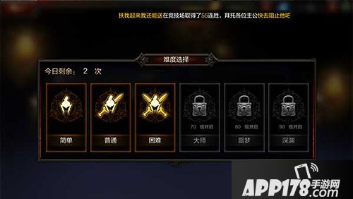 虽然阵容的要求是三名任意武将,但却给我们提供武攻+20%,物防+20%的强大BUFF,因此建议使用物理武将上阵,享受BUFF带来的额外战斗力。值得注意的是,大师、噩梦、深渊难度级别的副本将在我们70级、80级和90级时开放。