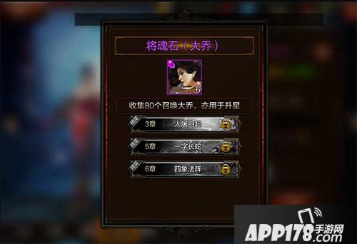 大乔将魂石可以通过通关精英关卡第3章【人屠白起】、第5章【一字长蛇】、第6章【四象法阵】获得。集齐80个魂石即可召唤一星紫色武将大乔。