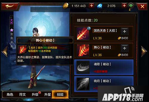 【被动】舞心+2品阶解锁:【光环】提升10法术防御,每级提升10法术防御;【效果】大乔以曼妙之舞姿,鼓动全队,提升全队法术防御。