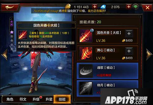 【大招】国色天香:【属性】降低15法术防御(10秒),每级降低15法术防御;【效果】大乔快速连续甩动脚鞭,对目标造成高额法术伤害,短时间内降低目标法术防御。