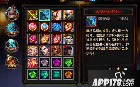 获得途径:参加跨服争霸赛,根据玩家的段位,即该段位的竞技场排名,每10分钟可获得指定数量的荣耀币。消耗荣耀币可在跨服争霸赛商店中购买到虎头湛金枪碎片。收集满200个虎头湛金枪碎片可以打造神器虎头湛金枪。神器—虎头湛金枪打造成功后,武将马超的武器会拥有绚丽的武器特效。虎头湛金枪碎片同时也是神器虎头湛金枪进化的必备材料。