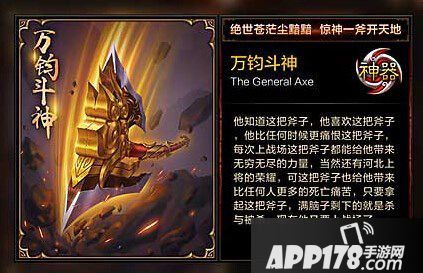 神器信息:万钧斗神是文丑的专属神器,文丑知道这把斧子,他喜欢这把斧子,他比任何时候都要痛恨这把斧子,每次上战场这把斧子都能给他带来无穷无尽的力量,当然还有河北上将的荣耀。可这把斧子也给他带来比任何人更多的死亡痛苦,只要拿起这把斧子,满脑子剩下的就是杀与被杀,现在他又要上战场了。
