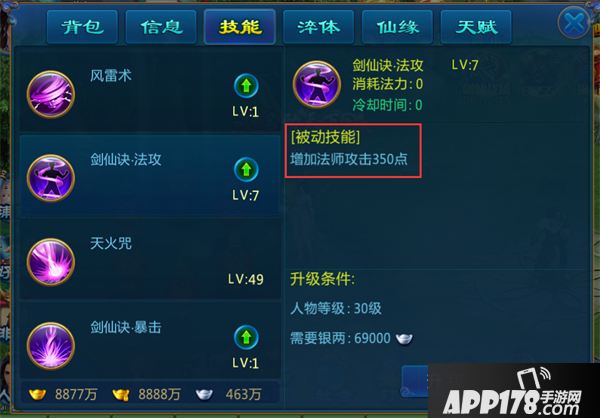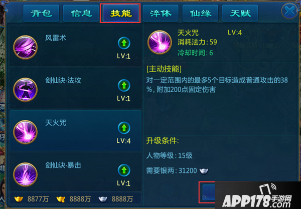 2、使用技能书后,即可学习相应技能,再点开人物--技能,点击“升级”就可以升级该技能。升级主动技能可以提升主动技能的伤害或功效;