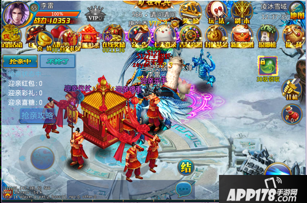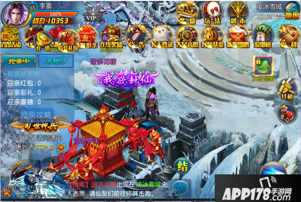 1、在庆典开始前10分钟内,跨服凌冰雪域会出现新郎新娘的喜轿并开始巡游,主界面跨服抢亲图标显示正在巡游和排队中的喜轿队伍,点击即可前往参与;