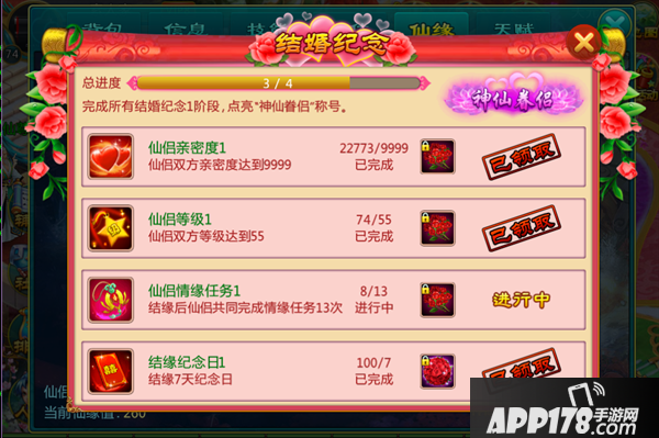1)完成所有结缘纪念点亮“神仙眷侣”称号,装备称号可获得属性加成