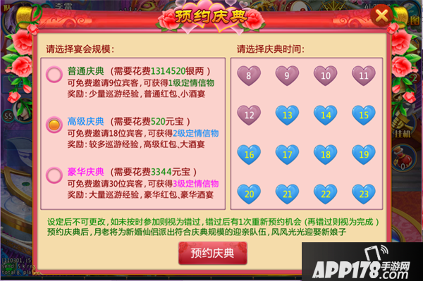 3、庆典时间和规模选择后不可更改,若错过时间,亦视为庆典已经完成,若遇上服务器维护,则可以再挑吉时重新预约一次相同规格的庆典。