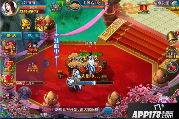 2、拜堂仪式持续1分钟,仪式结束后,场景内会刷新出婚宴食物,主人和宾客采集后可获得一定的经验,使用烟花和气球道具可以增加气氛值,气氛值到达一定等级可以获得采集经验加成。