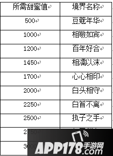 3)甜蜜度达到一定数值可激发境界效果,获得属性加成,目前共有10个境界等级。