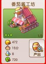 全民小镇番茄酱工坊主要还是用来生产番茄酱的,建造的时间比之前的要长一点,为15分钟,因为我们自己有番茄种子可以生产番茄,所以还是比较方便的。