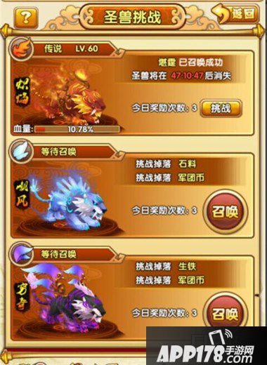 召唤出圣兽的主公,在圣兽被大家消灭后,可以通过邮箱收取圣兽礼包,获得丰厚奖励,而其他的军团成员,则可以通过去挑战被召唤出来的圣兽来获得奖励。记住,每天挑战前三次都可以获得奖励哦!