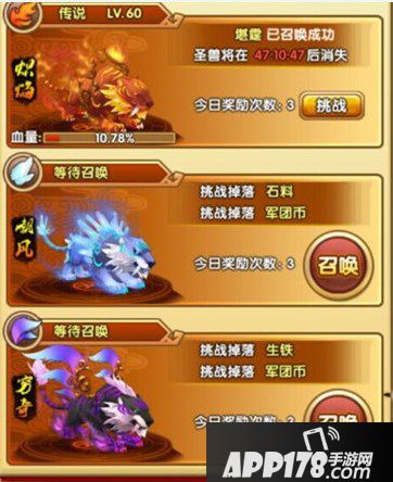 召唤出圣兽的主公,在圣兽被大家消灭后,可以通过邮箱收取圣兽礼包,获得丰厚奖励,而其他的军团成员,则可以通过去挑战被召唤出来的圣兽来获得奖励。记住,每天挑战前三次都可以获得奖励哦!