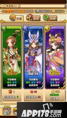 神将:可招募到蓝色、紫色品质武将。这种招募方式不需要任何物品,但是每次招募过后需要等待几十个小时,当然如果你花费288金币的话则可以招募一次,招募十次需要花费2592金币。但是貌似只能招募到紫将。到了后期还是自己做神将比较好!