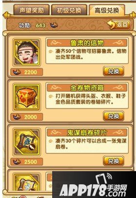 在军团战中的奖励兑换中的高级兑换中,玩家可以使用军团战中的功勋进行鲁肃的信物兑换,高级兑换必须玩家达到70级之后才能开启,兑换一个鲁肃信物需要2200功勋,所以兑换一个鲁肃需要50*2200=110000功勋,小编建议大家在军团战中得到的功勋不要乱用,可以收集起来首先兑换鲁肃!