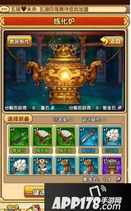 在炼化炉中玩家只能分解已经制成的装备,不能分解装备的碎片。分解的话可以得到紫金石,绿色装备分解可以得到10个紫金石,蓝色装备分解可以得到50个紫金石,紫色装备分解可以得到240紫金石!紫金石是制作套装的材料!