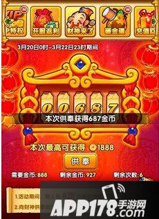 全民主公财神是玩家获得大量金币的一种手段,每半个月有一次财神,对于非R玩家来说攒钱等财神比抽将好的多。因为拜财神可以获得成倍数的金币增长。有足够金币的玩家可以在财神来的时候8拜财神,财神的翻倍是第一次需要88金币,最高获得288金币,第8次需要41111金币,最高获得78888金币,怎么样,是不是很赚!所以请把金币多留一些在财神这里吧。