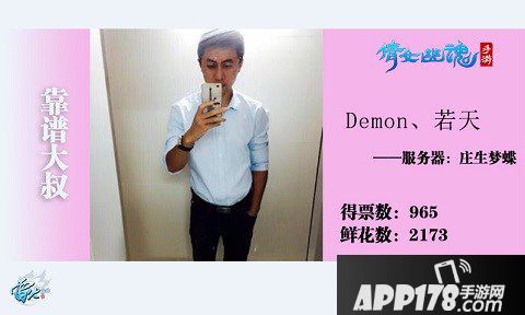 自从电视剧《微微一笑很倾城》播出之后,无数女玩家涌入倩女手游三界,男玩家史无前例的成为了香饽饽。一部分男玩家自觉担起了护花使者的重任,成为了#靠谱大叔#,带来了无限的安全感。庄生梦蝶服务器的Demon、若天,就以965票和2173朵鲜花的成绩,摘得了#靠谱大叔#榜单的冠军,获得了佳能微单哦。