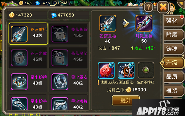 攻击套装和防具套装需要的升级材料不尽相同,攻击套装需要攻击魔石和机械零件,防具套装需要防御魔石和机械零件。此外,在升级为50或更高级的装备时需要注意,提升装备等级是有几率损失强化星级和品质等级的,最好备好对应等级的无损石才进行升级。