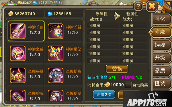 附魔是最有惊喜的一个玩法。每次消耗非常低,只需要一个附魔晶,就可以为装备直接附魔上多条属性。当然,实际出来的属性多不多,好不好,就全看一张脸了。一个运气好附出了橙色属性,别犹豫,赶紧换上!什么?替换后战力会降低?怕啥,用附魔锁把橙色属性锁上,分分钟再附出更高战力的属性出来。附魔的玩法大概就是这么一个循环:附魔→替换→锁定→附魔。只要脸好,几分钟就搞掂一个装备都是正常的。