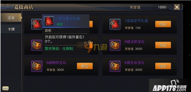 升星石:一级升星石,记住不要用钻石买,留钻石买别的战力道具除了礼包,系统送的和每日任务奖励的还可以在竞技场商店用荣誉购买(本人三测把升星石用完了,后来在多宝阁买了两千钻的一级升星石,结果装备都升到十二星了,一级不能用,每天看着包包里的一级升星石堆成堆却没有钻石买合成道具,一百钻一个太贵了)。