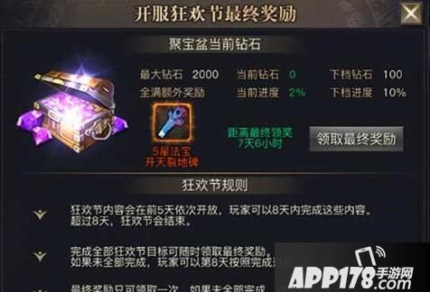随着玩家每天的游戏进度,活动会累积一个终极奖励,在活动结束前都可以领,终极奖励包括钻石、5星法宝等,建议玩家将狂欢节的进度累积100%之后再领该奖励,这样可领到满档大奖;