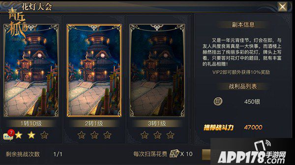 挑战副本的每个项目都能产出丰厚资源,然而其中却以“花灯大会”产出的银两最多。所以当玩家等级达到1转10级时,就可去参加花灯大会。作为银两的一个重要产出来源,玩家切莫忘记,花灯大会每日都可进行挑战,绝不能让任何一个赚钱机会从指尖溜走。