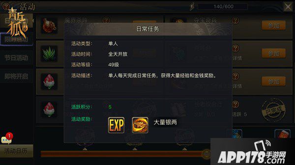 日常任务是《青丘狐传说》手游中一个稳定的银两获得途径。每位玩家每日都可免费领取10次日常任务。玩家只要完成日常任务,就能获得数量不菲的银两奖励,以及海量经验。一次投入,两份收获,如此好事岂能错过?