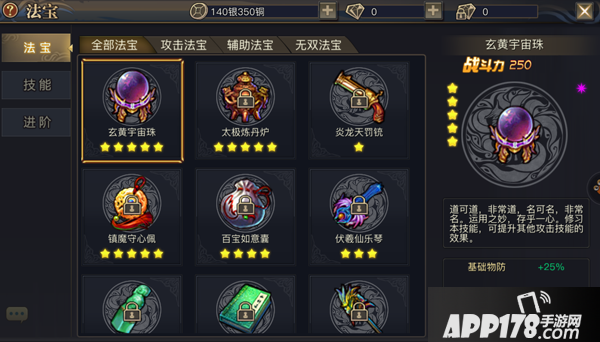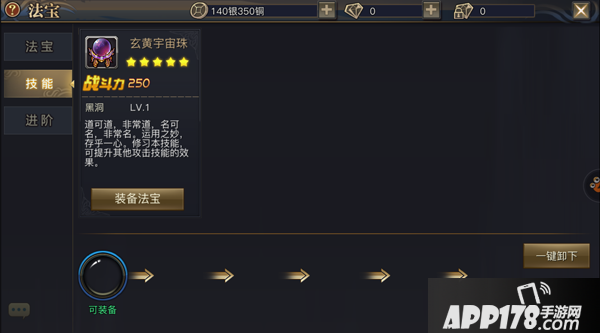 在法宝界面中,点击左侧“技能”按钮进入法宝技能装备界面。